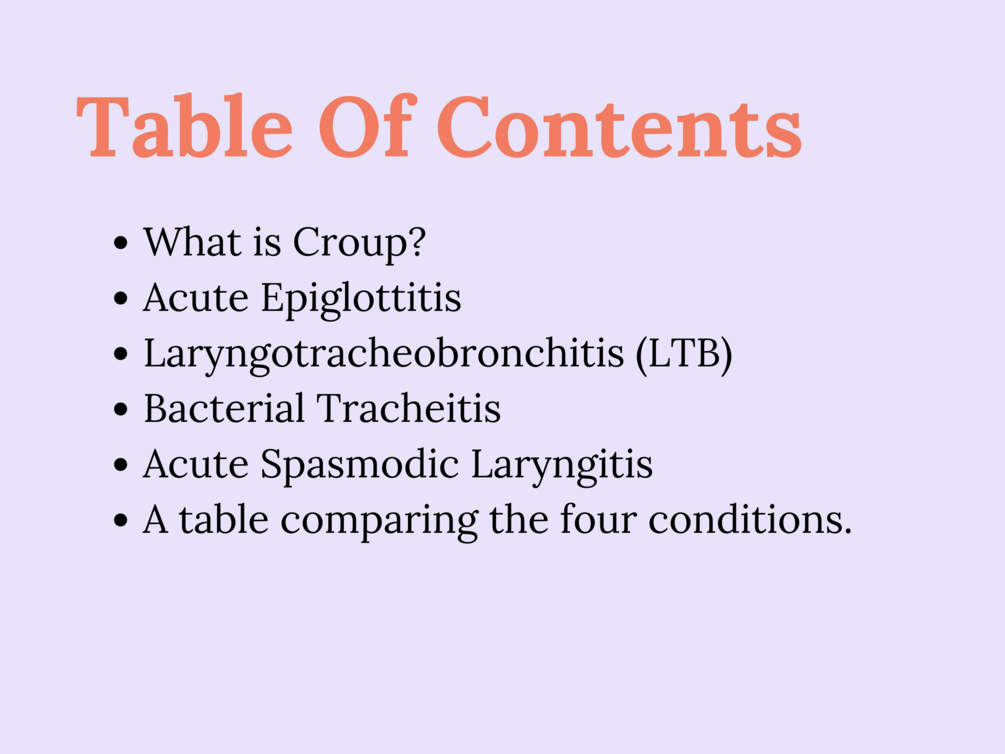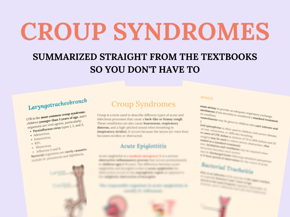 Nursing notes on croup syndromes in the pediatric population, summarized from the textbook and made easier to study. In this study guide you'll find relevant nursing information on Acute Epiglottitis, Laryngotracheobronchitis (LTB), Bacterial Tracheitis and lastly Acute Spasmodic Laryngitis and a GREAT BONUS a table comparing all four conditions inside in note form. You'll find pathophysiology, clinical manifestations, treatment, and nursing interventions.